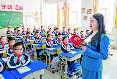 内蒙古自治区呼和浩特市玉泉区南柴火市街小学老师在“思政微课堂”上为学生讲党史。丁根厚摄/光明图片